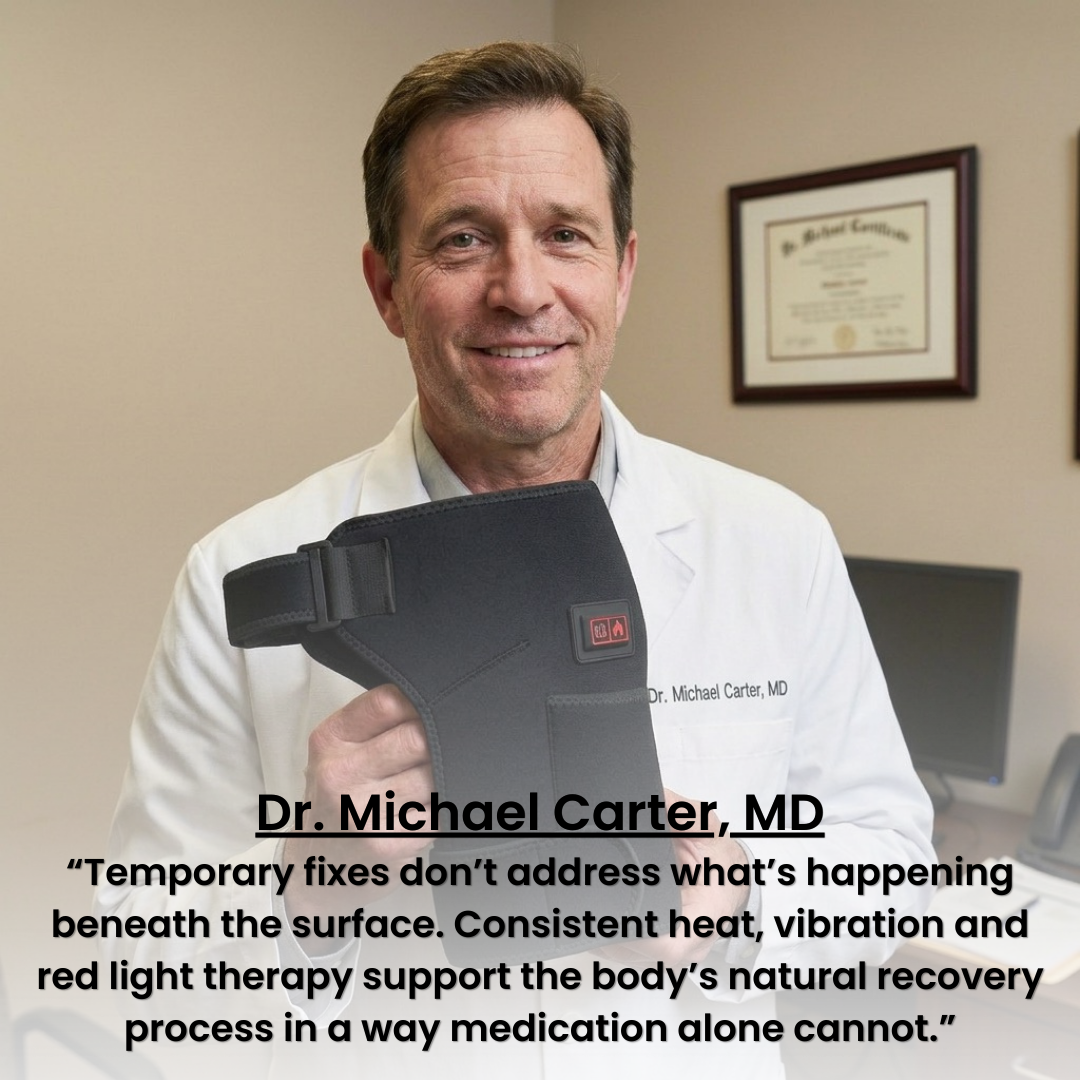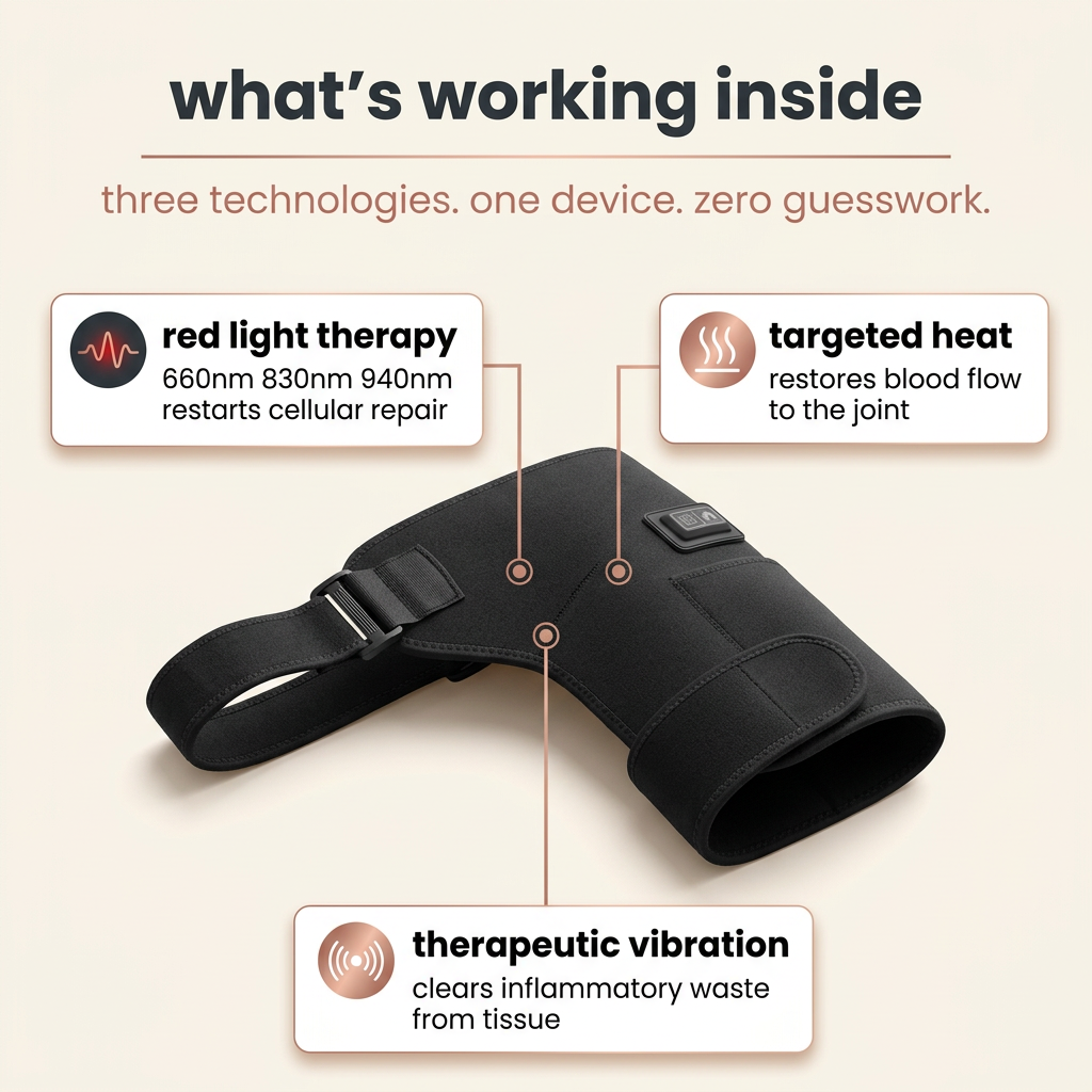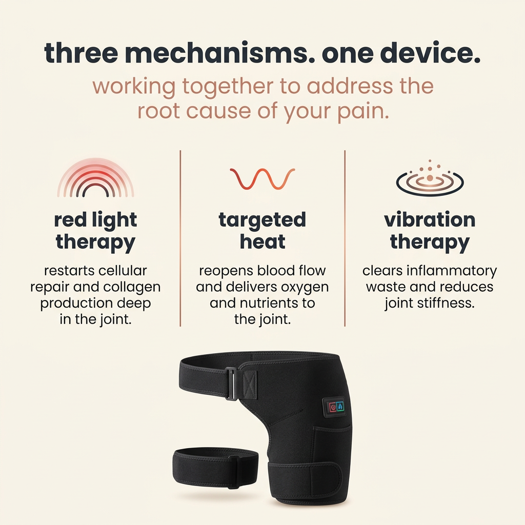 The Lumessia Renew is a wearable red light, heat and vibration therapy device that uses all three technologies simultaneously to reduce inflammation, restore circulation and trigger your body's own natural healing process — helping you recover the way your body was designed to, without medication or clinic visits.